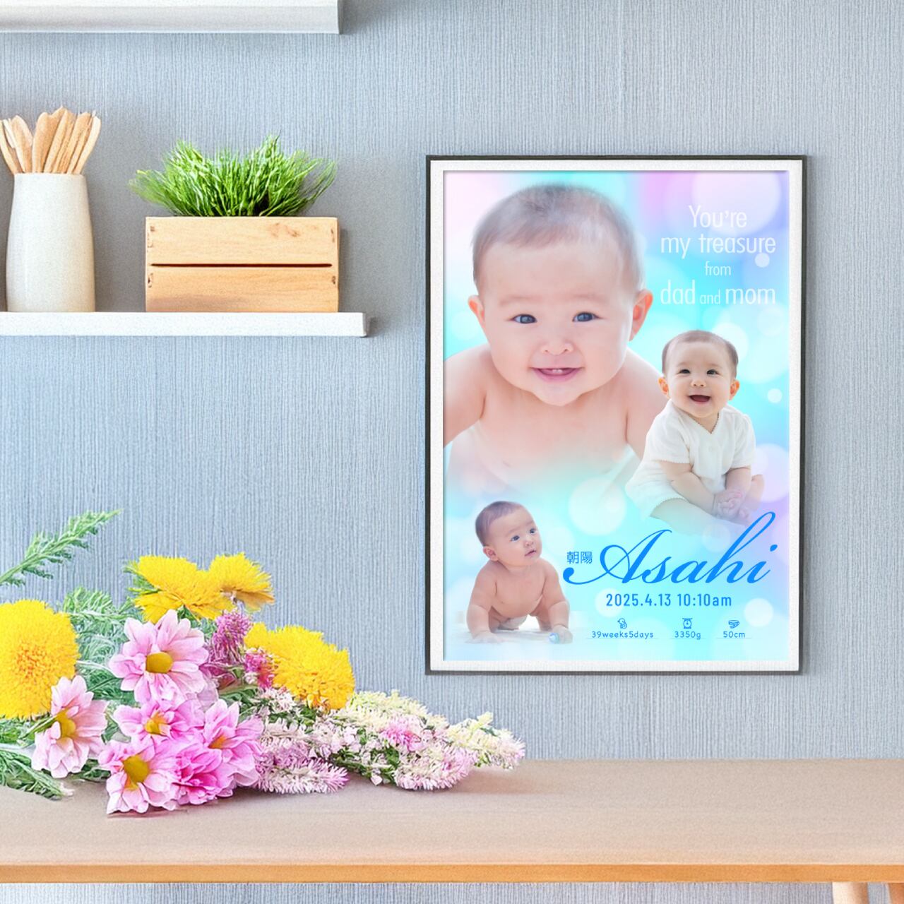 お子さまのお写真3枚と、お名前等を送っていただくだけで世界にひとつのメモリアルポスターが完成します。