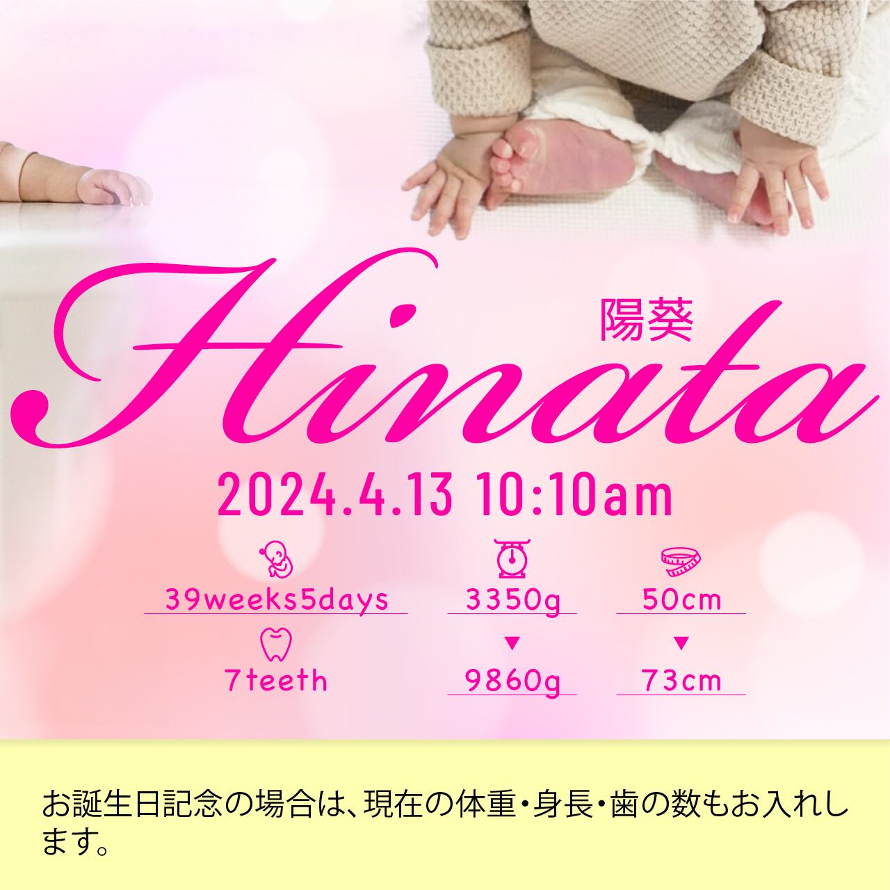 ◎生年月日、出生時間、お腹にいた週数、出生体重・身長をお入れします(誕生日記念の時は現在の体重・身長・歯の数もお入れします)。