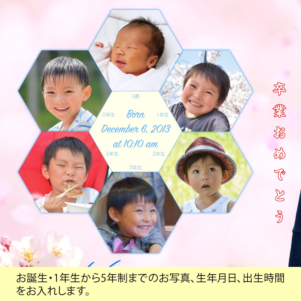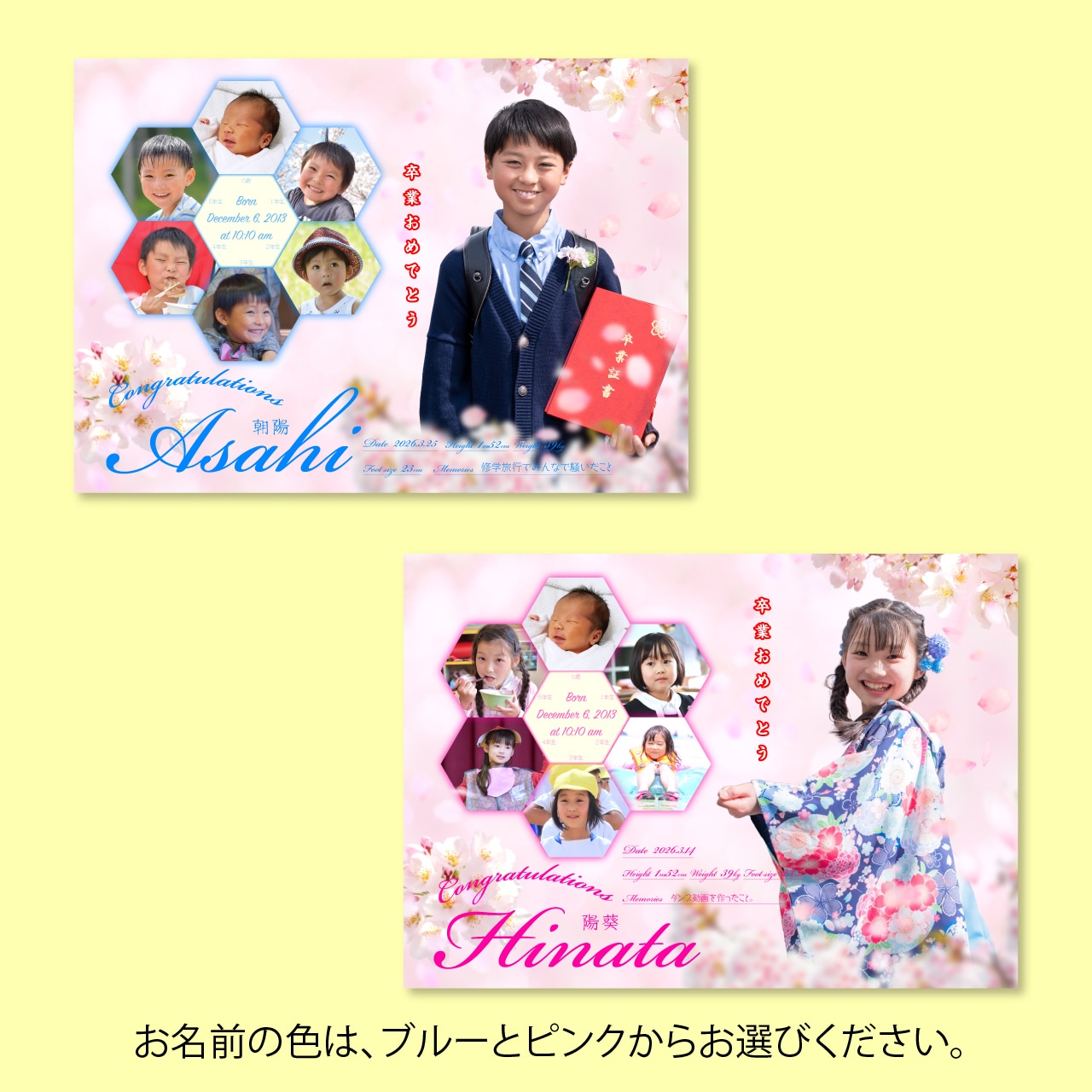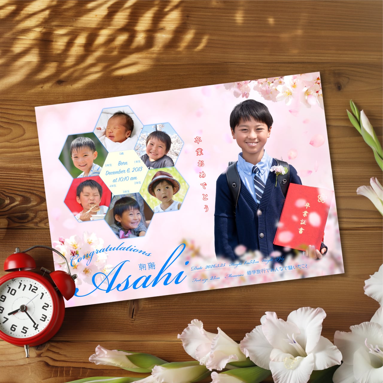 満開の桜の中に、幼い頃の写真と卒業式の晴れ姿をレイアウト。お子さまの成長の軌跡が、1枚のメモリアルポスターになります。