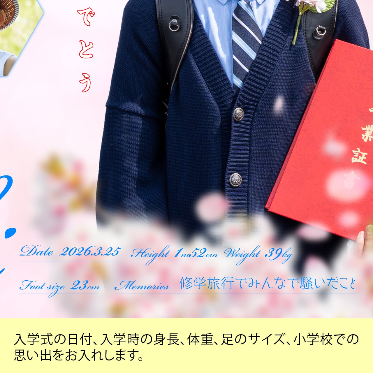 ・身長・体重・小学校の思い出などを入れて、世界にひとつだけの卒業メモリアルが完成します。